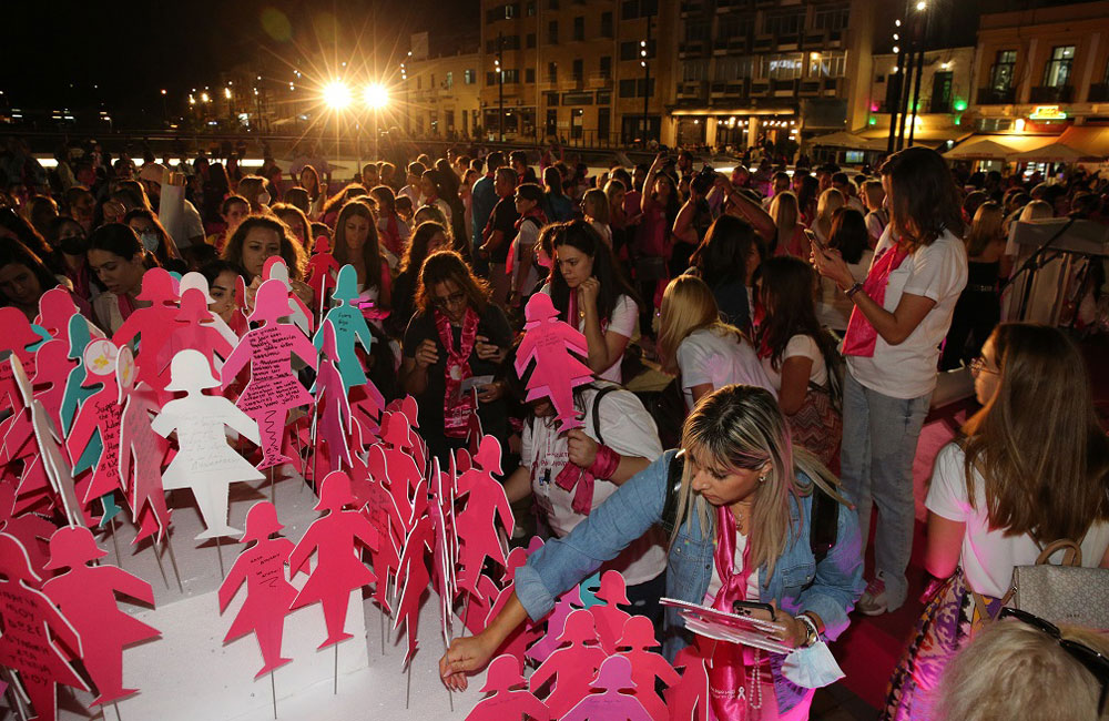 Οι συμμετέχοντες την πορεία, κράτησαν 610 Ροζ Φιγούρες που συμβολίζουν τα νέα περιστατικά καρκίνου του μαστού που καταγράφηκαν το 2021 σε γυναίκες, 3 Γαλάζιες που συμβολίζουν τα νέα περιστατικά καρκίνου του μαστού που καταγράφηκαν σε άνδρες, 55 Τιρκουάζ φιγούρες οι οποίες συμβολίζουν τον αριθμό των νέων περιστατικών καρκίνου των ωοθηκών, και 123 Λευκές Φιγούρες που συμβολίζουν τα άτομα που έχασαν τη ζωή τους